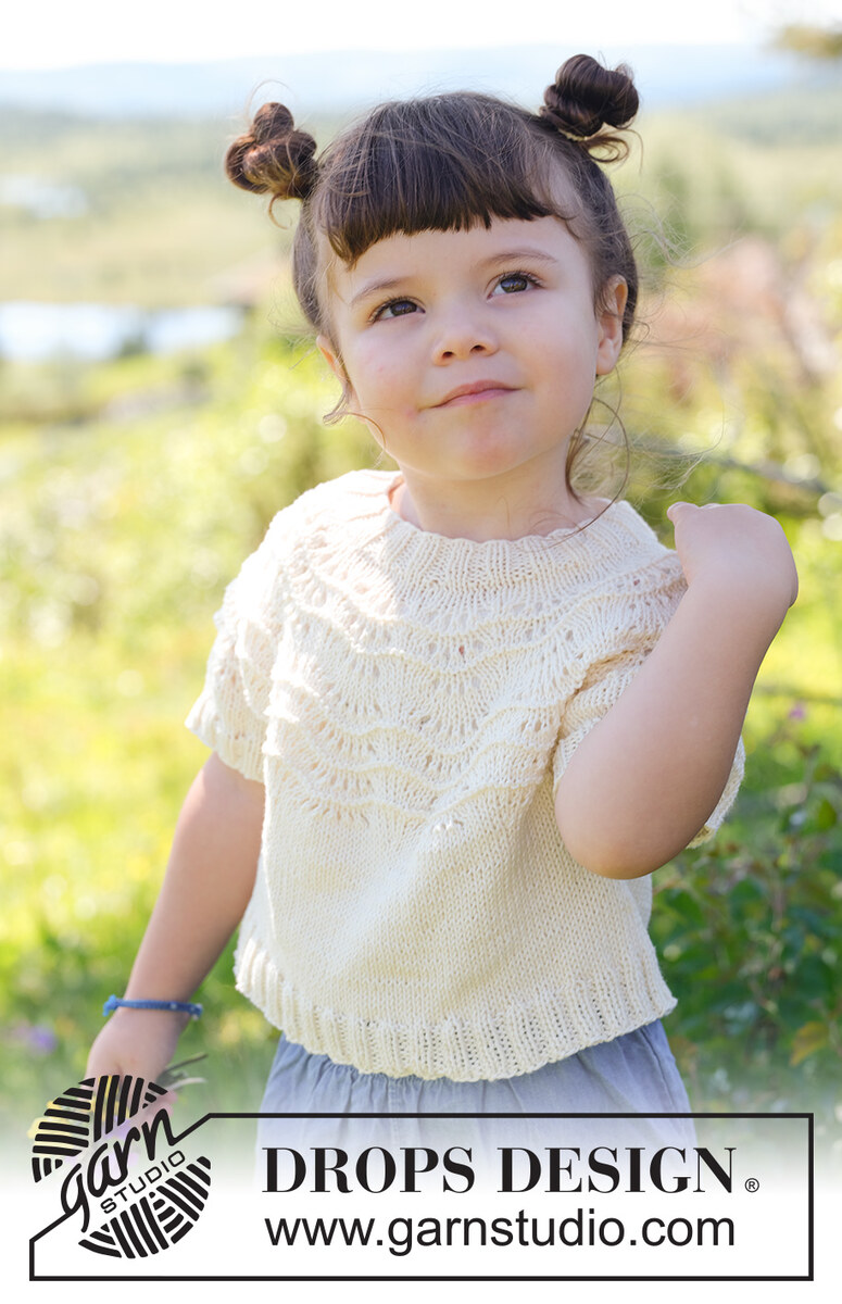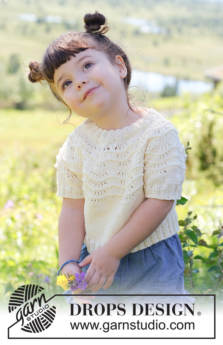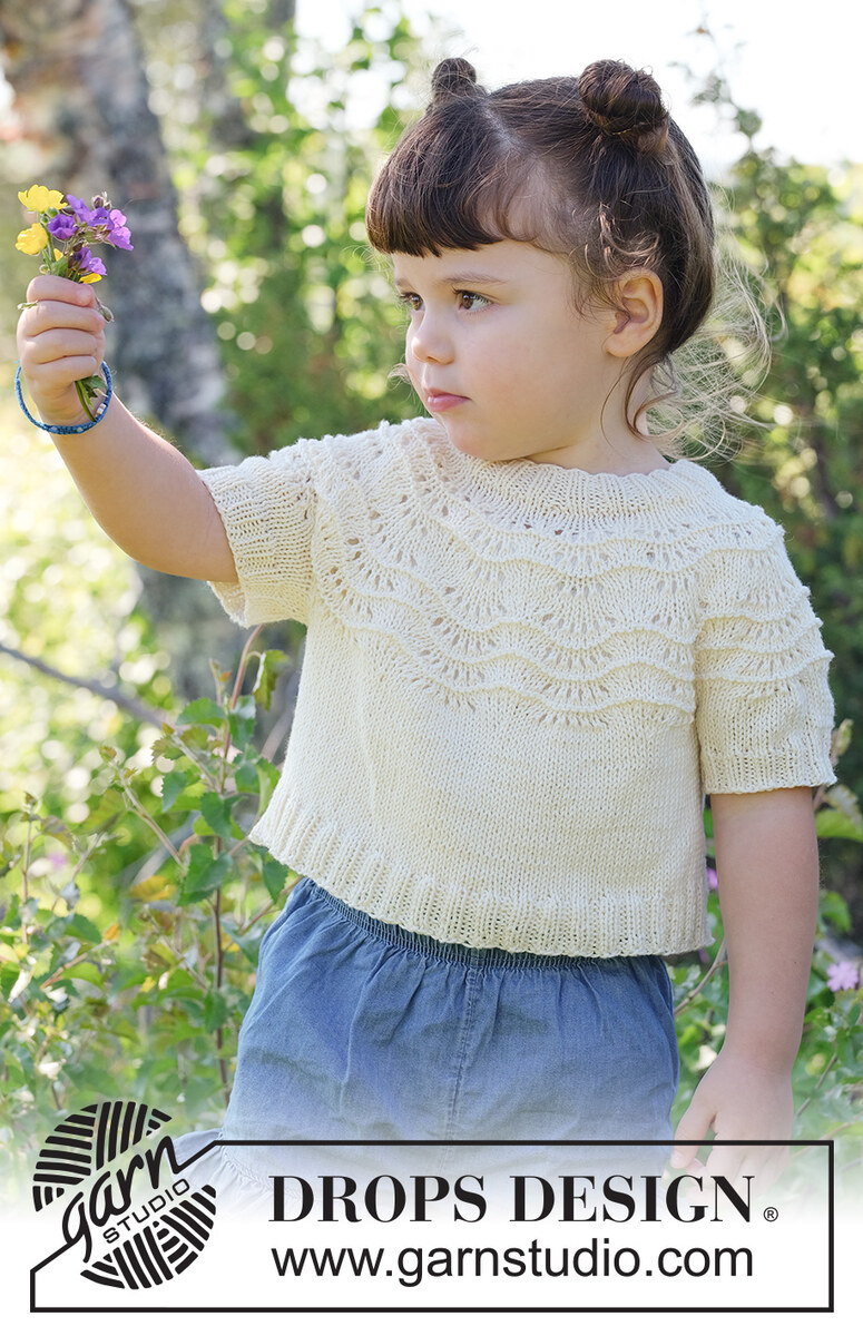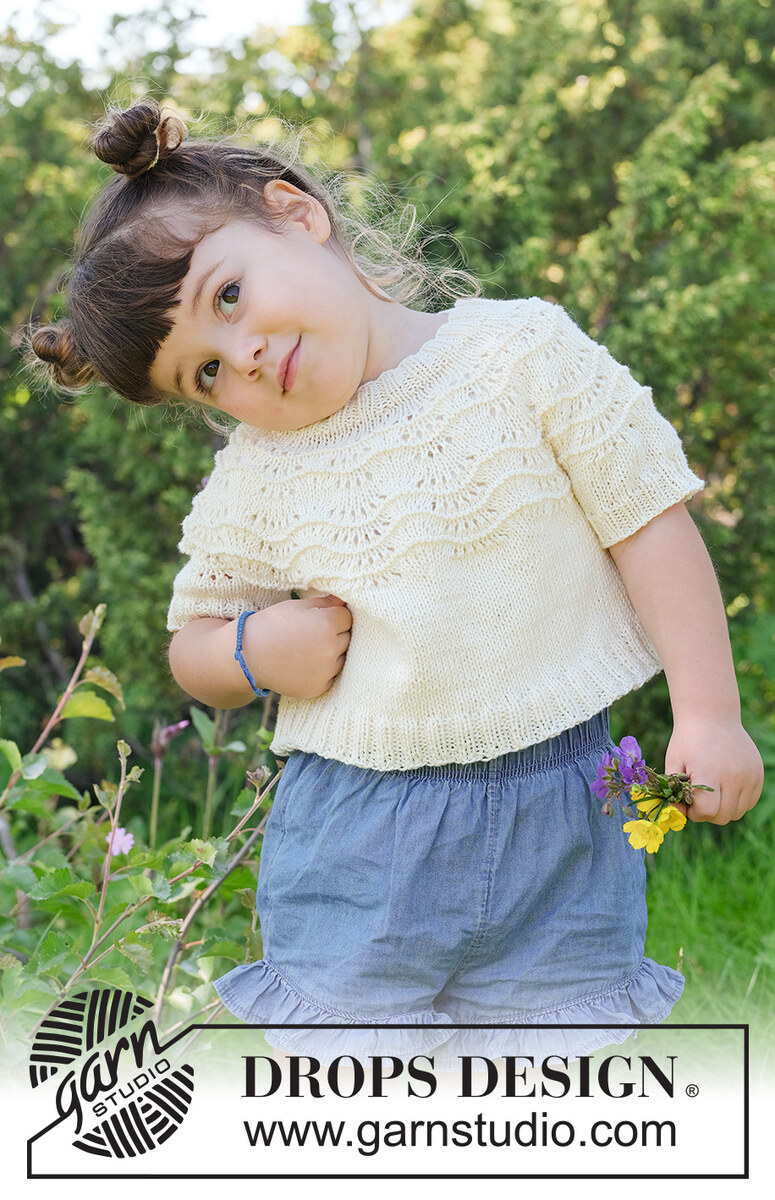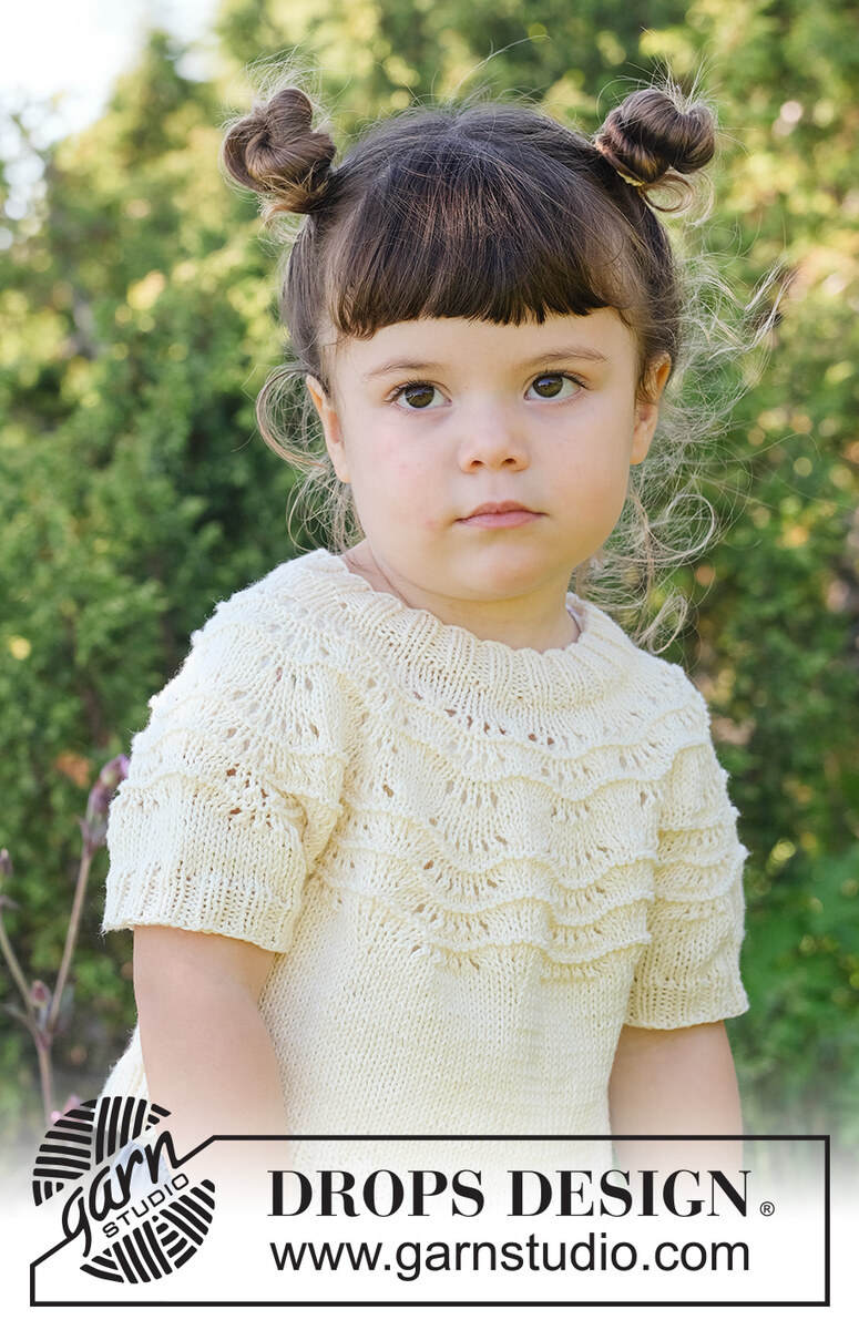 Pull tricoté de haut en bas pour enfant en DROPS Safran ou en DROPS Baby Merino. Se tricote avec empiècement arrondi et point de vagues. Du 2 au 12 ans