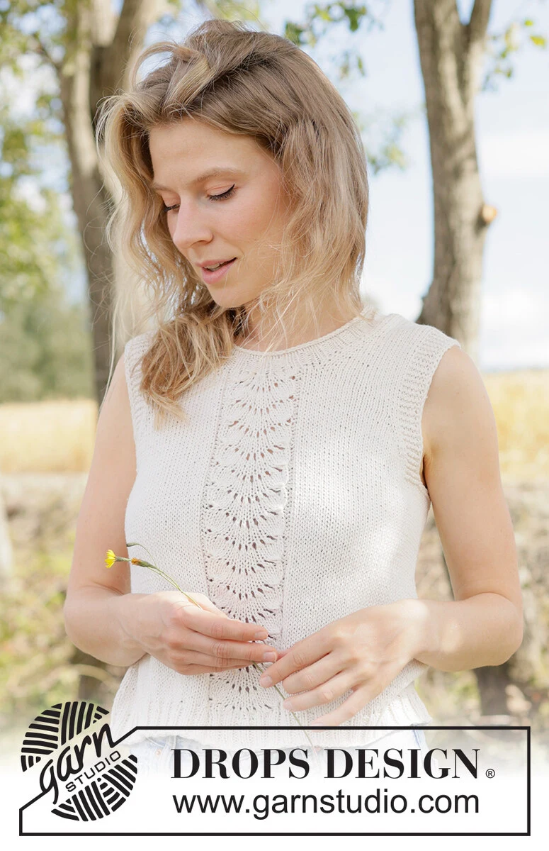 Top tricoté en DROPS Belle. Se tricote de haut en bas avec point de vagues et I-cord. Du XS au XXXL.