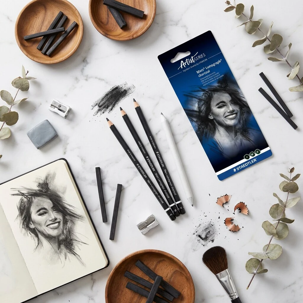 Si vous recherchez un charbon qui offre des noirs profonds tout en restant facile à contrôler comme un crayon, Mars® Lumograph® 100C est un excellent choix. Vous obtenez des degrés assortis et une estompe pratique, pour travailler les valeurs aussi bien de manière détaillée que plus libre. Un set simple pour démarrer facilement, et idéal pour perfectionner votre technique.