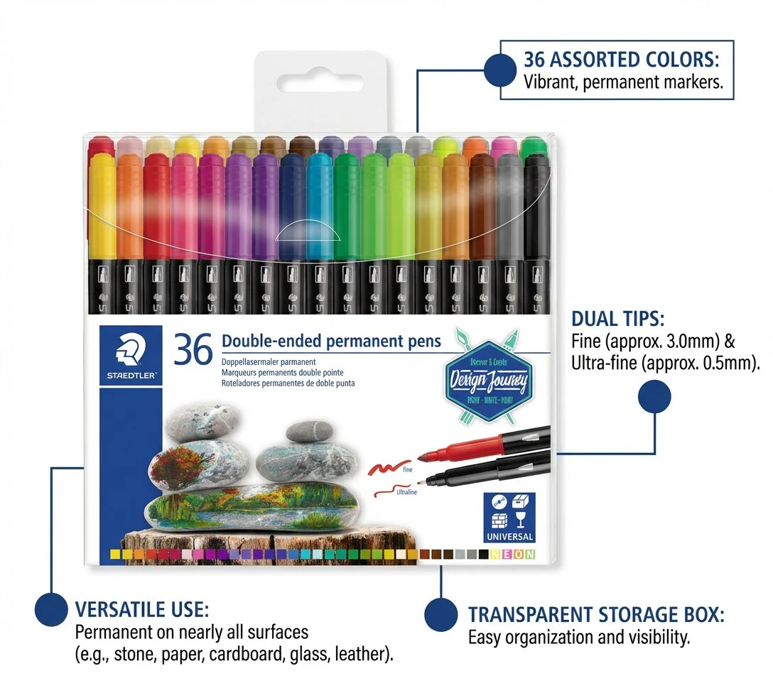 Avec les STAEDTLER® 3187, vous obtenez un set polyvalent de marqueurs permanents double pointe, adapté aussi bien aux marquages rapides qu’aux détails créatifs. Deux pointes par feutre offrent une grande fonctionnalité, et les 36 couleurs vous donnent de nombreuses possibilités pour varier les effets. Si vous voulez des traits bien visibles et un set utilisable sur de multiples surfaces, c’est un choix sûr pour votre prochain projet.