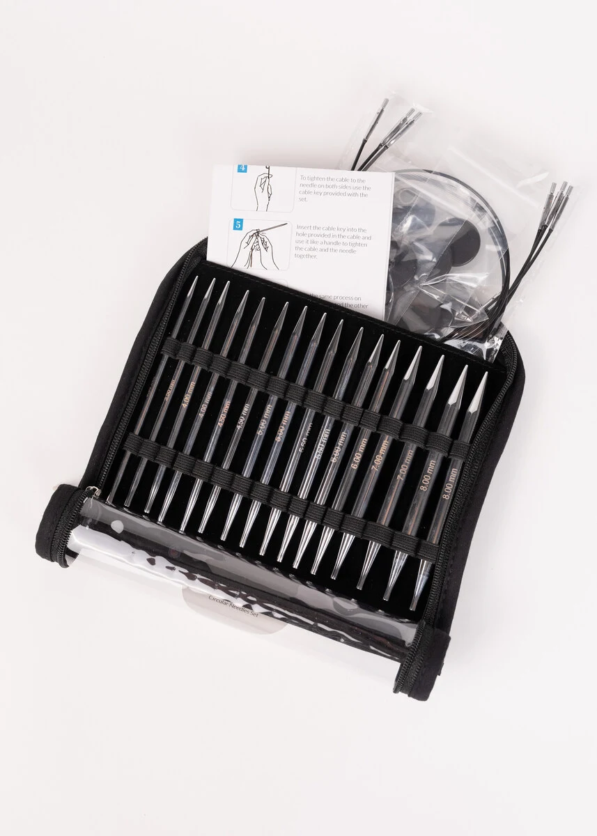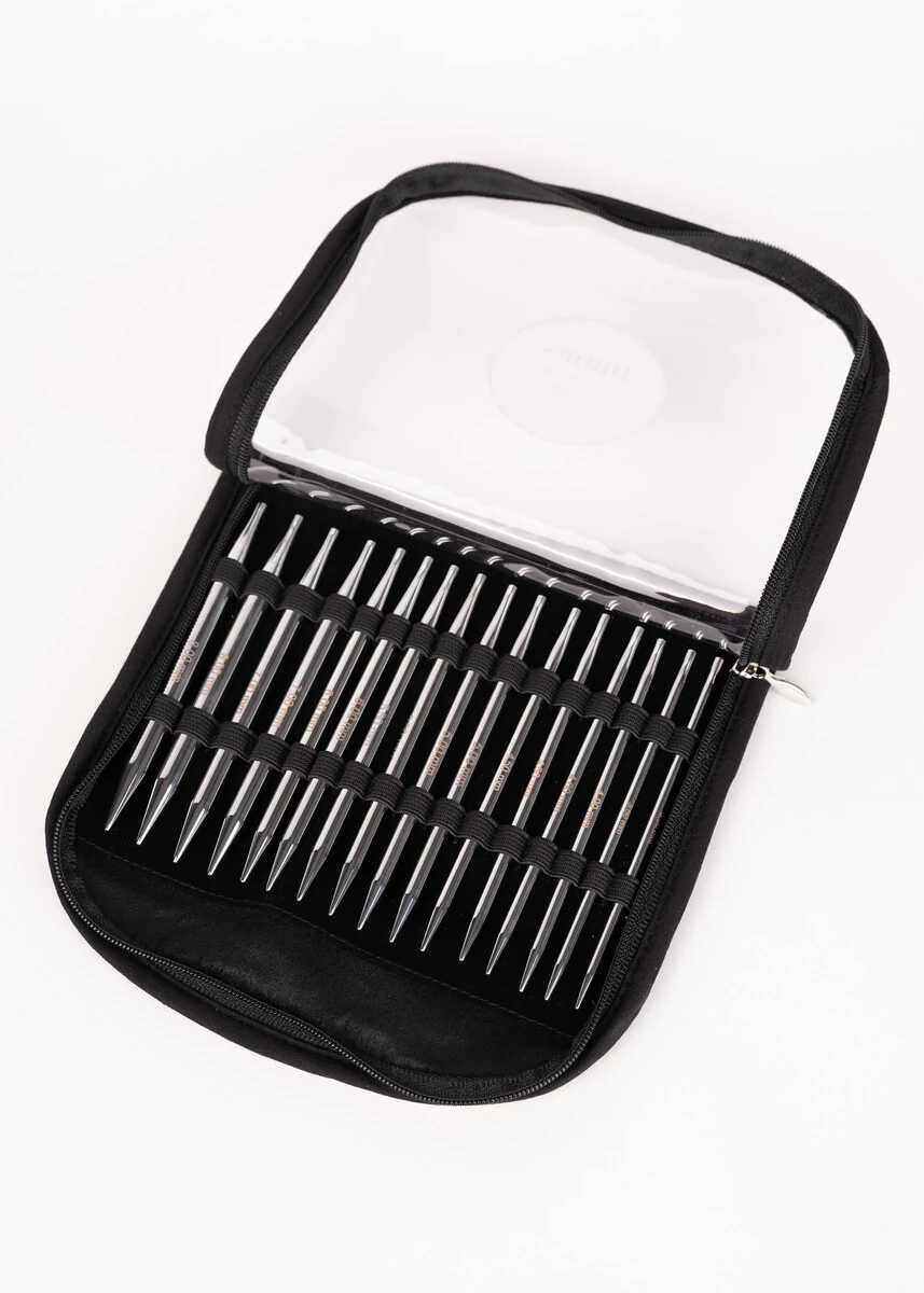 Le set est livré dans une trousse textile pratique avec une face avant transparente en vinyle, ce qui vous permet de garder facilement une vue d’ensemble sur vos aiguilles et accessoires. Les aiguilles interchangeables se vissent facilement sur les câbles, ce qui vous permet de combiner différentes tailles et longueurs selon votre projet.