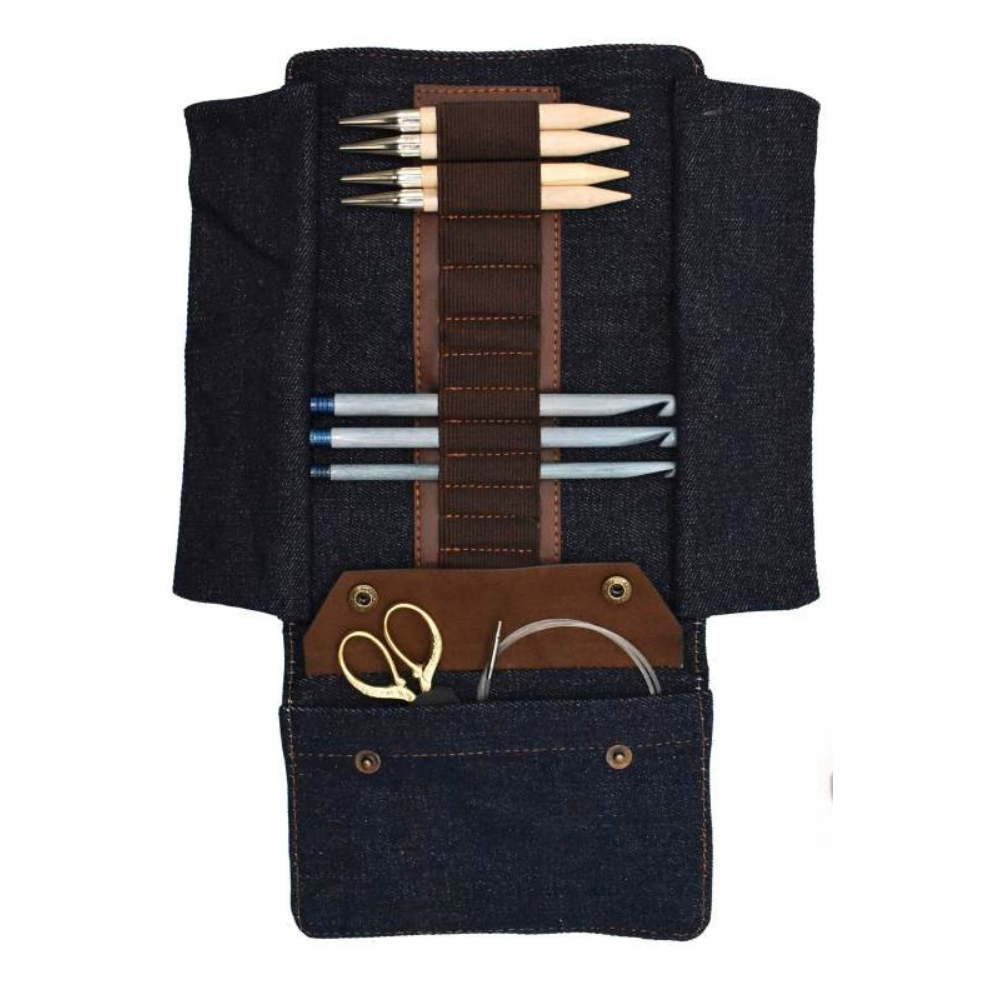 Un étui élégant et pratique de LYKKE, conçu pour ranger vos aiguilles circulaires interchangeables de 13 cm ainsi que vos crochets tunisiens. Fabriqué en denim résistant et en beau cuir végétalien – un choix idéal pour les tricoteurs et crocheteurs organisés.