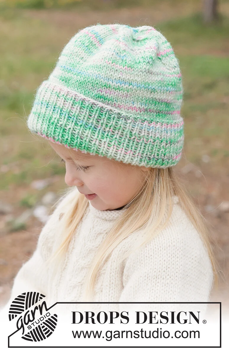 Gebreide muts voor kinderen in DROPS Fiesta. Het werk wordt in tricotsteek gebreid met omvouw. Maten 2 - 14 jaar.