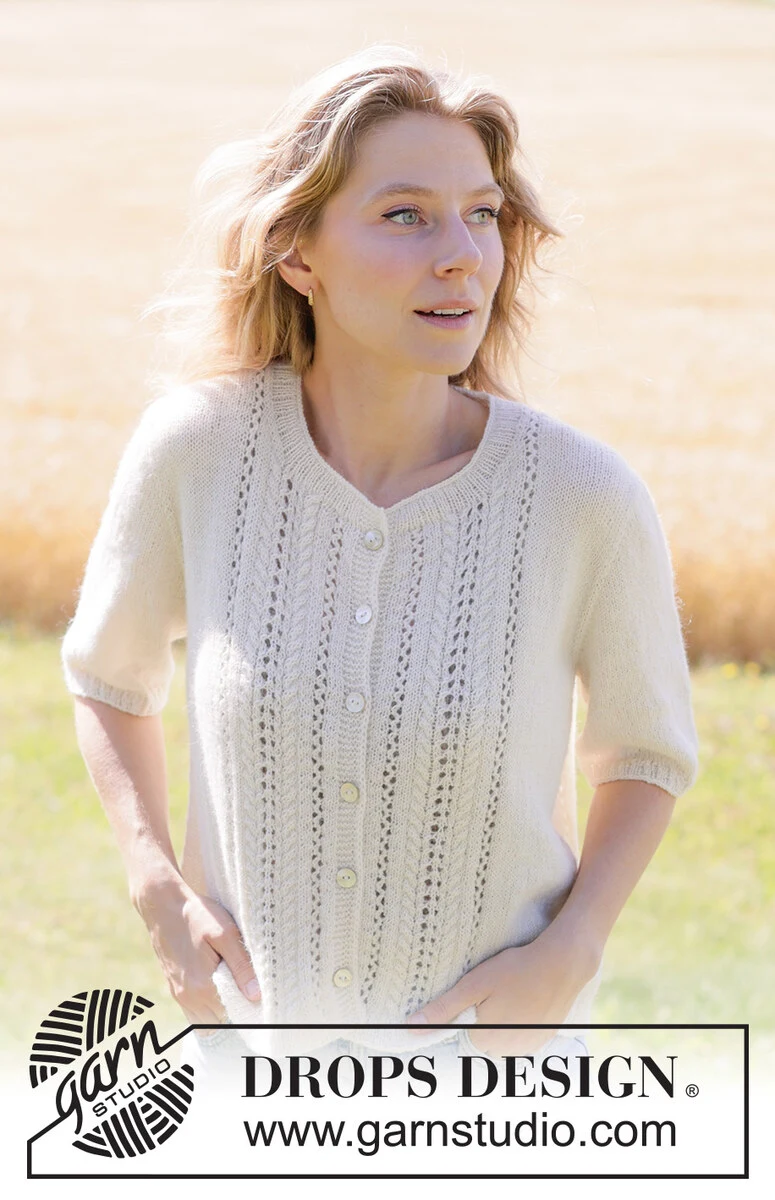 Gebreid vest in DROPS Nord. Het werk wordt van boven naar beneden gebreid met Europese pas, kantpatroon, PUNNIKRAND en korte mouwen. Maten XS - XXXL.