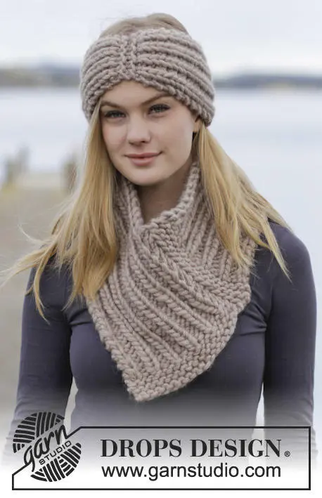 De set bestaat uit: Gebreide DROPS hoofdband en halslijn van " DROPS Polaris " met boordstof.